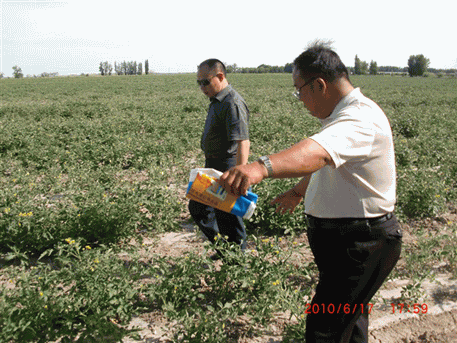 2010年,公司土壤改良劑在新疆奎屯種植大戶棉花和番茄地里試驗(yàn)示范圖