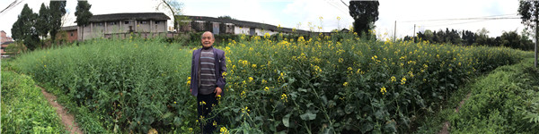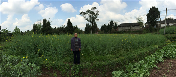 圖為:姚永訓站在自己豐收在望的油菜地里