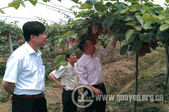 公司董事長(zhǎng)李智強(qiáng)向秘書長(zhǎng)介紹種植的獼猴桃新品種 董事長(zhǎng)向辛士秘書長(zhǎng)介紹獼猴桃果實(shí)套袋技術(shù)