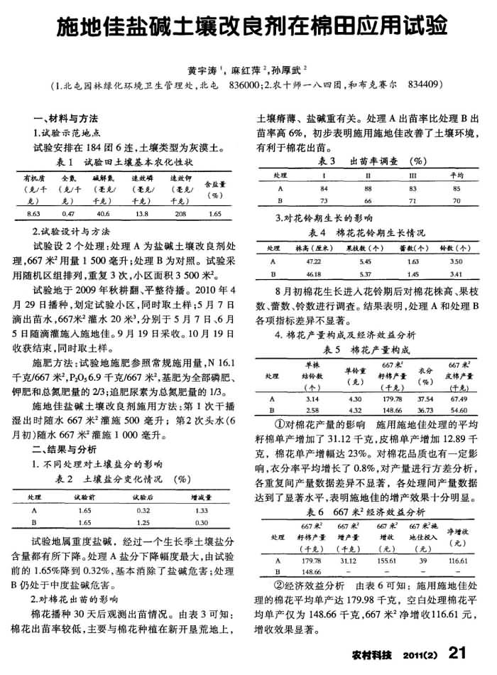 《農(nóng)村科技》2011年第2期 “施地佳”鹽堿土壤調(diào)理劑在棉田應用試驗