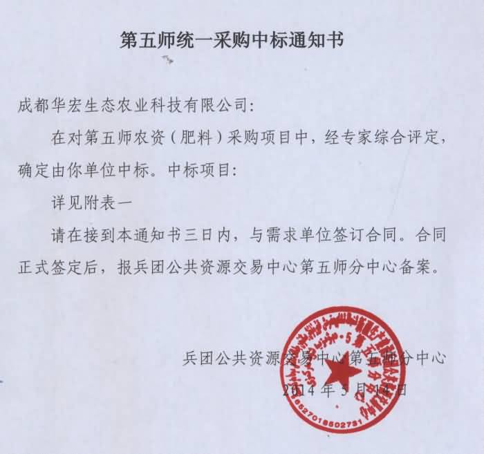 公司產(chǎn)品中標(biāo)新疆兵團(tuán)第五師農(nóng)資采購(gòu)項(xiàng)目