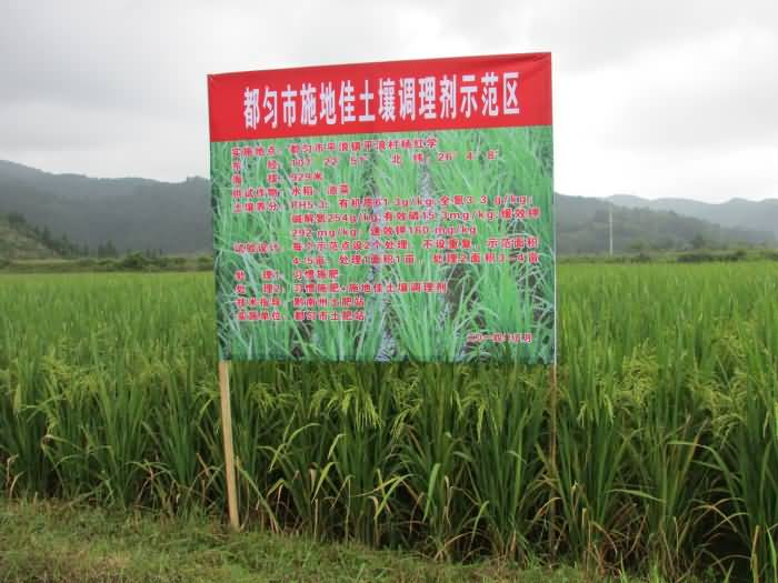 2014年農(nóng)業(yè)部全國農(nóng)技推廣服務(wù)中心安排在貴州省都勻市土肥站進行酸化土壤調(diào)理的試驗,試驗結(jié)果顯示“施地佳”酸化土壤調(diào)理劑第一年在當?shù)刂饕Z食作物水稻上的試驗成功,實驗結(jié)果土壤酸度降低,土壤容重降低,稻谷增產(chǎn)幅度達到6%以上,我們的試驗計劃是三年定點示范,為我們的土壤改良總結(jié)一套成功的可行的實施方案。