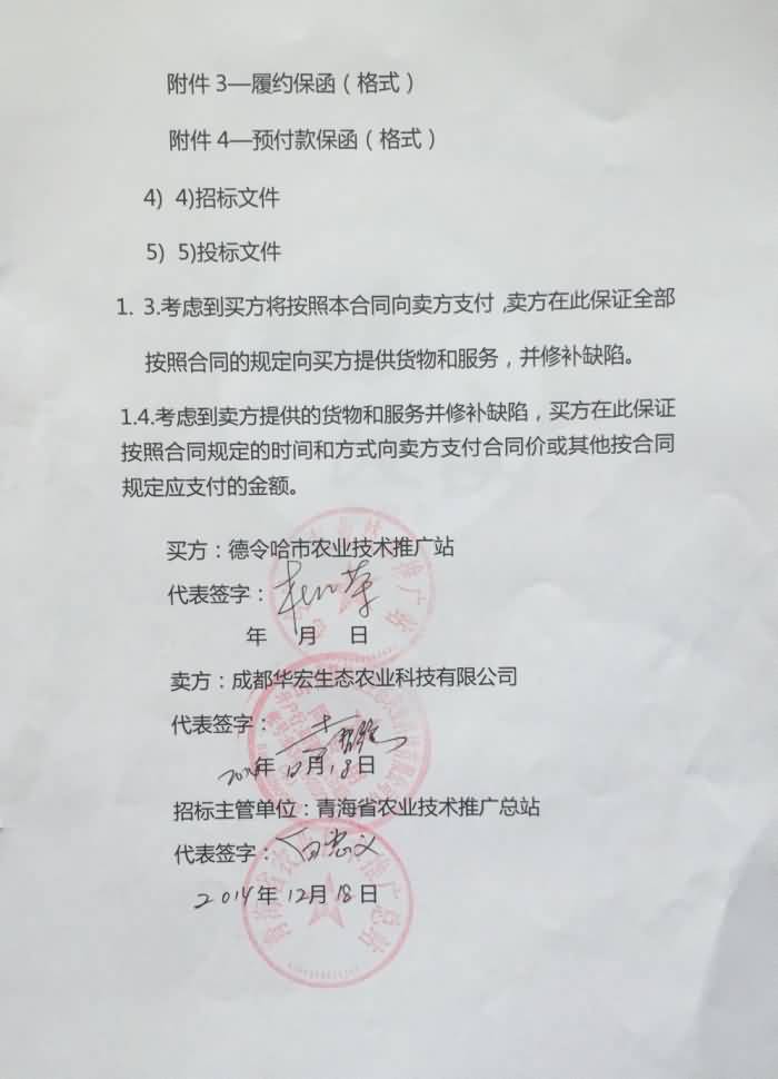 為完成國家土壤有機(jī)質(zhì)提升項目任務(wù),青海省德令哈市農(nóng)業(yè)技術(shù)推廣站主管并委托青海誠德招標(biāo)代理有限公司對青海省2014年耕地保護(hù)與質(zhì)量提升補(bǔ)助項目進(jìn)行公開招標(biāo),接受了成都華宏生態(tài)農(nóng)業(yè)科技有限公司以總價60萬元向青海省德令哈市農(nóng)業(yè)技術(shù)推廣站供應(yīng)經(jīng)過多年試驗示范的可信度極高的鹽堿土壤調(diào)理劑。