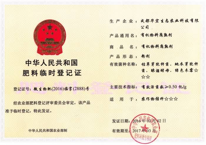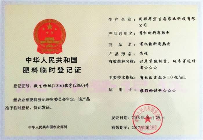 成都華宏生物喜獲國(guó)家液體、粉劑秸稈腐熟劑登記證